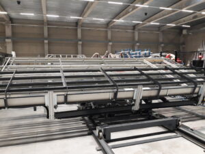001TN ermöglicht den automatischen Transfer und die Vertikalisierung von Rahmen, wodurch die interne Logistik zwischen Schweißen, Lagerung und Montage vereinfacht wird.