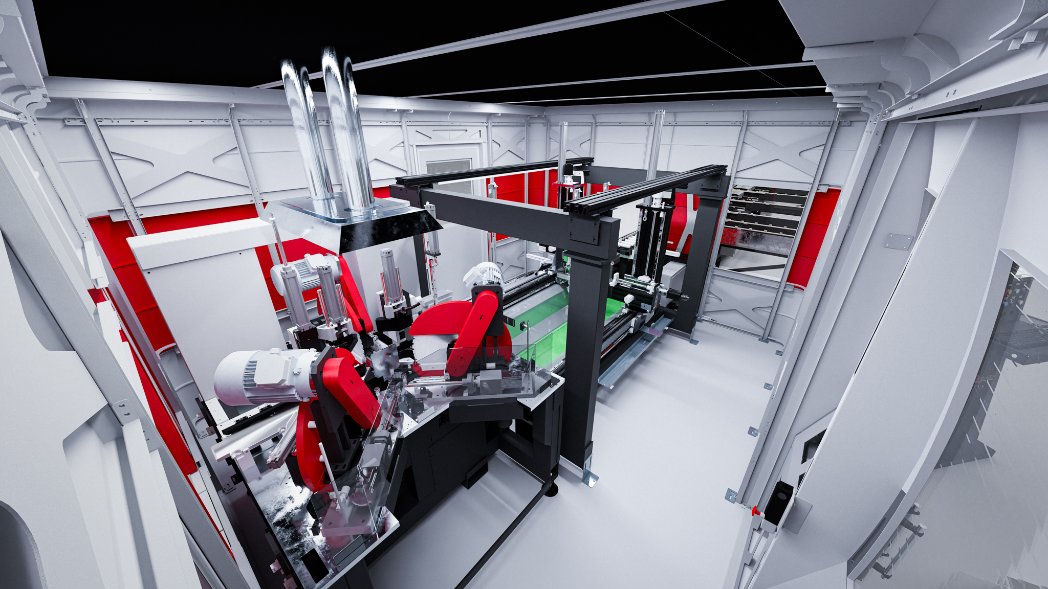 Die Anlage besteht aus drei Hauptmodulen: einem automatischen Ladesystem mit doppeltem CNC-Greifer, einem Arbeitsmodul mit zwei unabhängigen Hochgeschwindigkeits-Spindeln und einem Schneidmodul mit drei synchronisierten Klingen. Jedes Bauteil ist optimiert, um Stillstandszeiten zu minimieren, die Präzision zu maximieren und einen kontinuierlichen Betrieb auch bei komplex geformten Profilen zu gewährleisten.